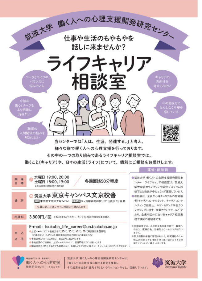 筑波大学ライフキャリア相談室では、働くこと(キャリア)や生き方・生活(ライフ)について